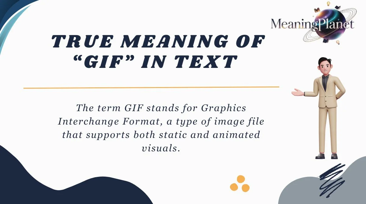 The term GIF stands for Graphics Interchange Format, a type of image file that supports both static and animated visuals. In simple words, a GIF is a looping short animation that plays automatically without sound. In texting or social media, when someone says, “I sent you a GIF,” they usually mean a moving picture or short clip expressing an emotion, reaction, or situation.